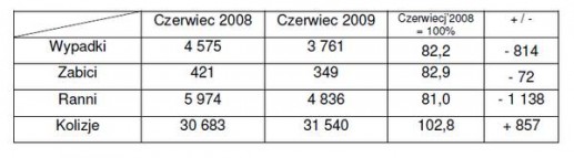 Poniższa tabela obrazuje porównanie tych danych ze stanem bezpieczeństwa drogowego w czerwcu 2008 roku: