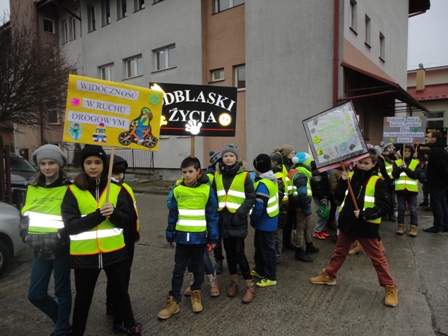 - „ … podczas happeningu w naszej miejscowości uczniowie rozdawali ulotki, odblaski pozyskane od sponsorów, oraz przeprowadzali wywiady z mieszkańcami na temat noszenia odblasków”,