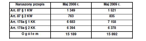 W maju 2009 roku policjanci ujawnili ogółem 2356 kierujących pojazdami po użyciu alkoholu lub podobnie działającego środka (art. 87 par. 1 i 2 Kodeksu wykroczeń), z czego 1521 kierujących pojazdami mechanicznymi po użyciu alkoholu lub podobnie działającego środka (art. 87 par. 1 Kodeksu wykroczeń).