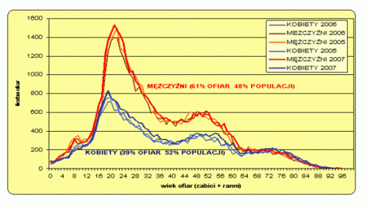 Rys. 4. Ofiary wypadków drogowych w Polsce w latach 2005-2007 wg wieku i płci