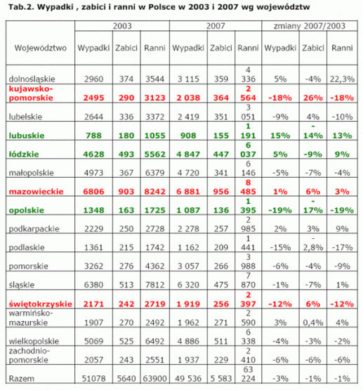 Analiza zagrożenia w poszczególnych rejonach kraju w latach 2003-2007 wykazała, że w ciągu ostatnich 5 lat liczba zabitych w skali kraju spadła zaledwie o 1% jednak w większości województw nastąpiła poprawa sytuacji. Jednak w 6 województwach nastąpił wzrost liczby zabitych, największy w województwie kujawsko-pomorskim (+26%), mazowieckim (+6%) i świętokrzyskim (+6%). Największy spadek liczby zabitych zanotowano w województwie opolskim (-17%), lubuskim (-17%) i łódzkim (-9%).