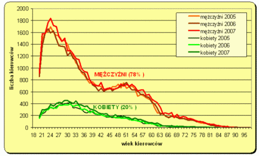 Zdecydowana większość kierujących uczestniczących w wypadkach to mężczyźni (80%). Kobiety uczestniczą w wypadkach znacznie rzadziej. Stanowiły one tylko 18% kierujących, którzy brali udział w wypadkach w 2007 roku. Niestety kierujących kobiet uczestniczących w wypadkach przybywa szybciej niż kierujących mężczyzn i w stosunku do 2006 roku było ich więcej o 12% (1405) podczas gdy kierujących mężczyzn o 4% (2364).
