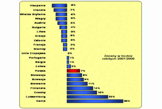 Europie również nie udało się osiągnąć założonego celu (spadek zabitych w latach 2001-2010 o 50%). Liczba ofiar śmiertelnych w 24 krajach (dla 3 krajów nie ma danych) zamiast zmaleć utrzymała się na poziomie z 2006 roku (43 tys. zabitych). W 12 krajach liczba zabitych wzrosła od 1% (Belgia) do 30% (Dania) ale nawet w krajach od lat odnotowujących poprawę bezpieczeństwa, wystąpiły zaledwie niewielkie spadki (rys.2). Najlepsze wyniki uzyskała Hiszpania (-8%), Irlandia (-7%), Węgry i Wielka Brytania (-6%). Niestety Polska ma znaczny wkład w złe statystyki, jako że zabici na polskich drogach stanowią około 13% wszystkich osób, które zginęły na drogach Unii Europejskiej.