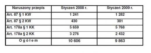 W styczniu 2009 roku policjanci ujawnili ogółem 1663 kierujących pojazdami po użyciu alkoholu lub podobnie działającego środka, zakwalifikowanych z art. 87 par. 1 i 2 kodeksu wykroczeń.
