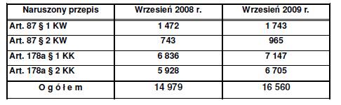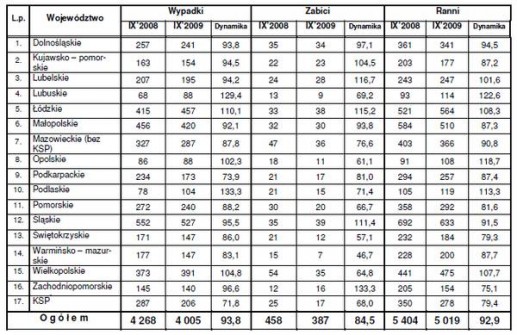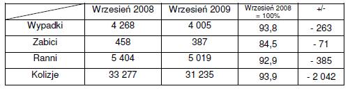 Poniższa tabela obrazuje porównanie tych danych ze stanem bezpieczeństwa drogowego we wrześniu 2008 roku: