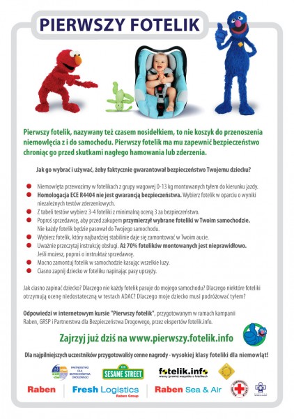 „Pierwszy fotelik” - właściwe używanie fotelików samochodowych dla niemowląt – międzynarodowa inicjatywa społeczna Grupy Raben, Globalnego Partnerstwa dla Bezpieczeństwa Ruchu Drogowego (GRSP), Partnerstwa dla Bezpieczeństwa Drogowego w Polsce, Ulicy Sezamkowej, serwisu fotelik.info i PCK.