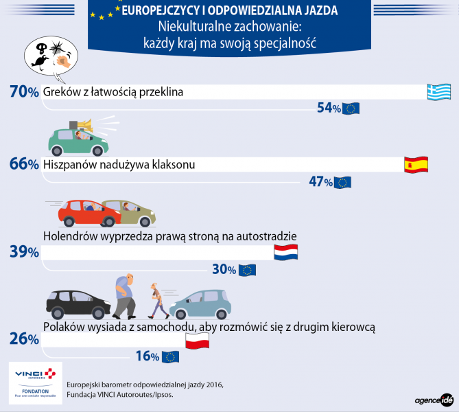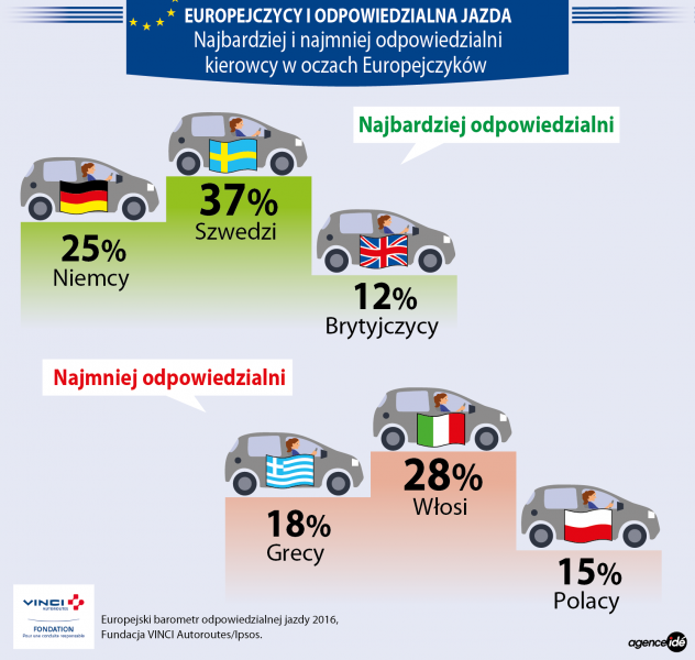 Europejczycy jednomyślnie twierdzą, że wzorowymi kierowcami są Szwedzi (37%), zaś najmniej odpowiedzialnymi Włosi (28%). Na Polaków narzekają przede wszystkim sami Polacy: 44% Polaków uznaje, że ojczyzną najbardziej nieodpowiedzialnych kierowców jest właśnie Polska, daleko przed Włochami czy Grecją.