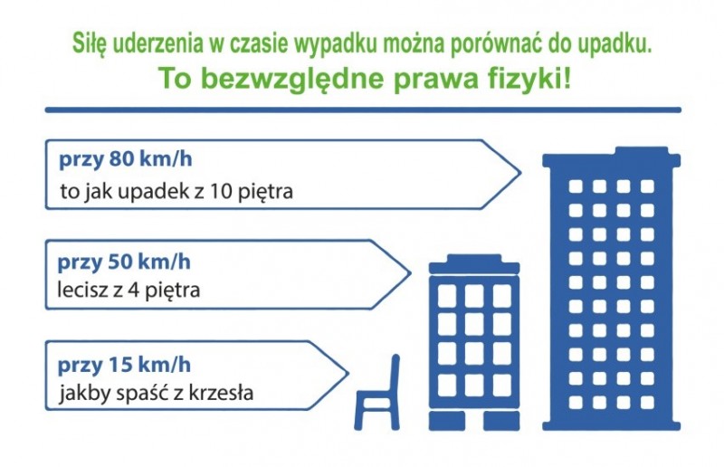 FAKTY: Nagłe zderzenie z jakąś prędkością można porównać do upadku z pewnej wysokości. W przypadku zderzenia z prędkością 15 km/h uderzenie będzie takie jakby spaść z krzesła. Zderzenie przy prędkości 50 km/h będzie miało taki sam efekt, jak upadek z 4 piętra. Zderzenie z prędkością 80 km / h można porównać do upadku z 10 piętra!